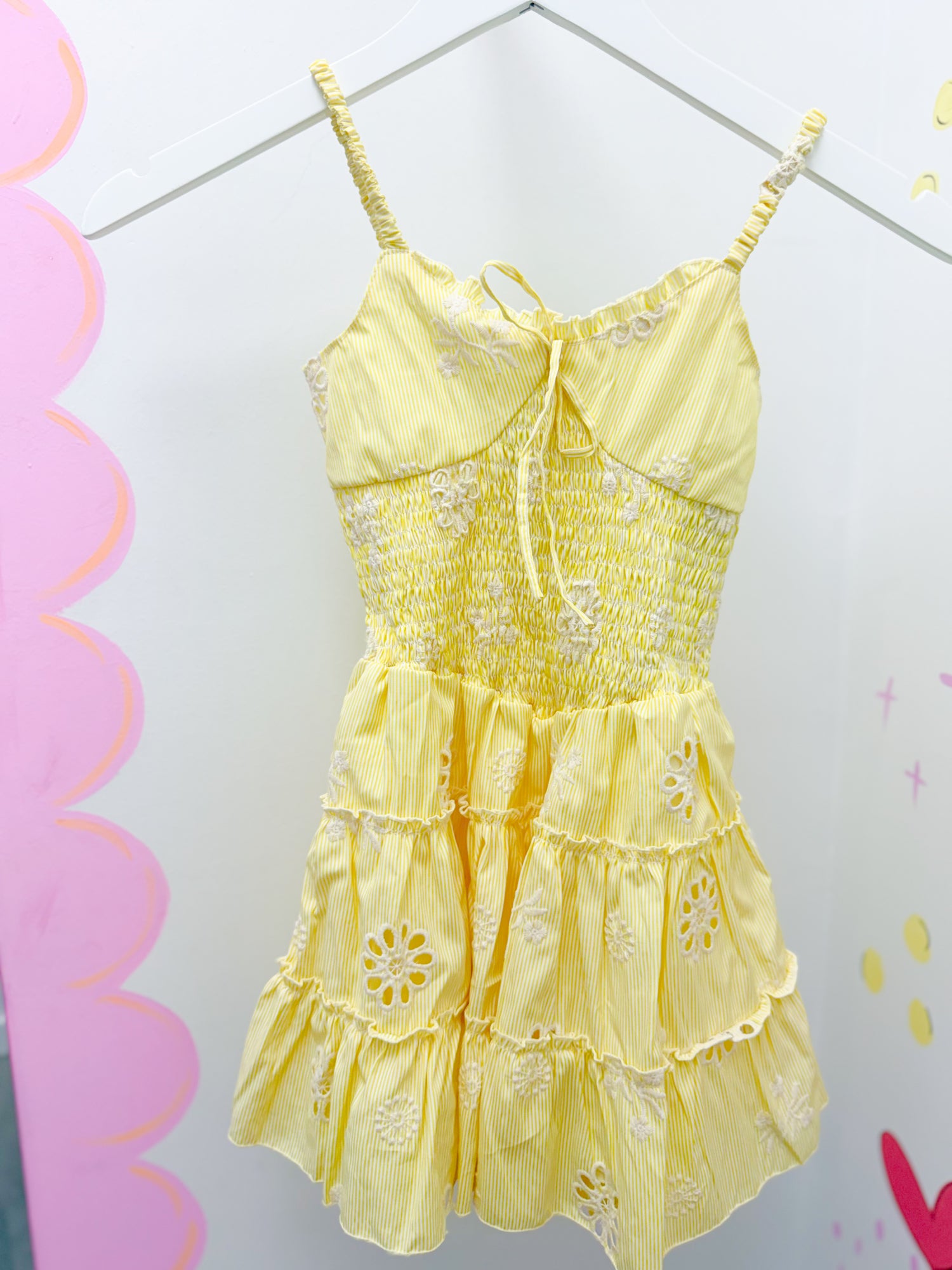 Butter Yellow Eyelet Dress Brighten your wardrobe with this cheerful butter yellow eyelet dress. The delicate eyelet detailing adds a charming, feminine touch perfect for warm weather outings. Lightweight and breathable, it's ideal for casual days or dressed-up occasions. A versatile piece that pairs easily with sneakers, sandals, or flats.