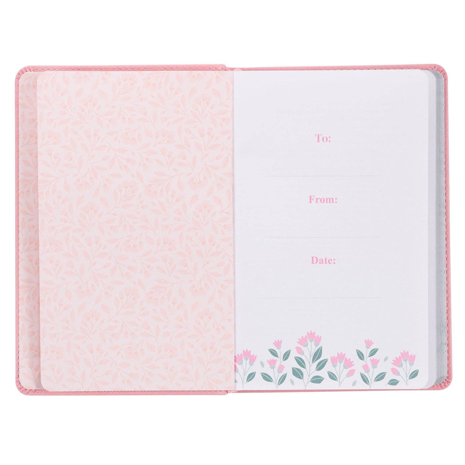 Heat-debossed frame with corner scroll designs, Pink faux leather, Silver-foiled title, Flexcover, Two-color interior, Satin ribbon marker, 348 gilt-edged pages, 100 devotions, Size: 7.2" x 4.8" x .8" (183 x 122 x 20mm)