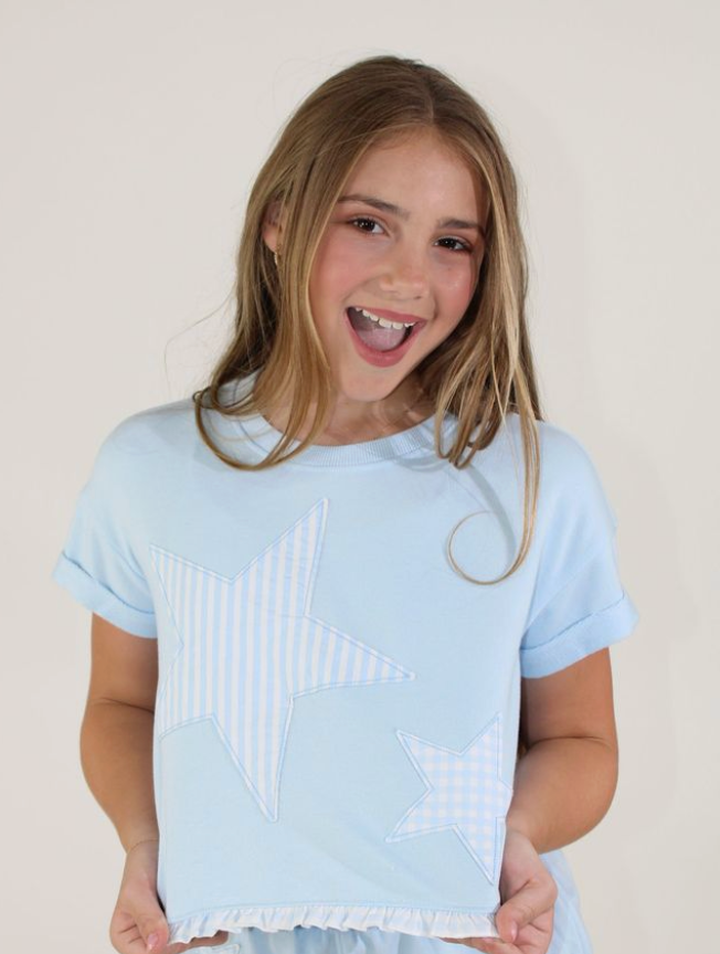 Star Applique with Ruffle Hem Top Brighten her wardrobe with this charming tee featuring a playful star applique on the front. The ruffled hem adds a fun, feminine touch that kids love. Made for everyday wear, it's perfect for school, playdates, or casual outings. Soft and comfortable, this top pairs easily with jeans, shorts, or leggings for effortless style.